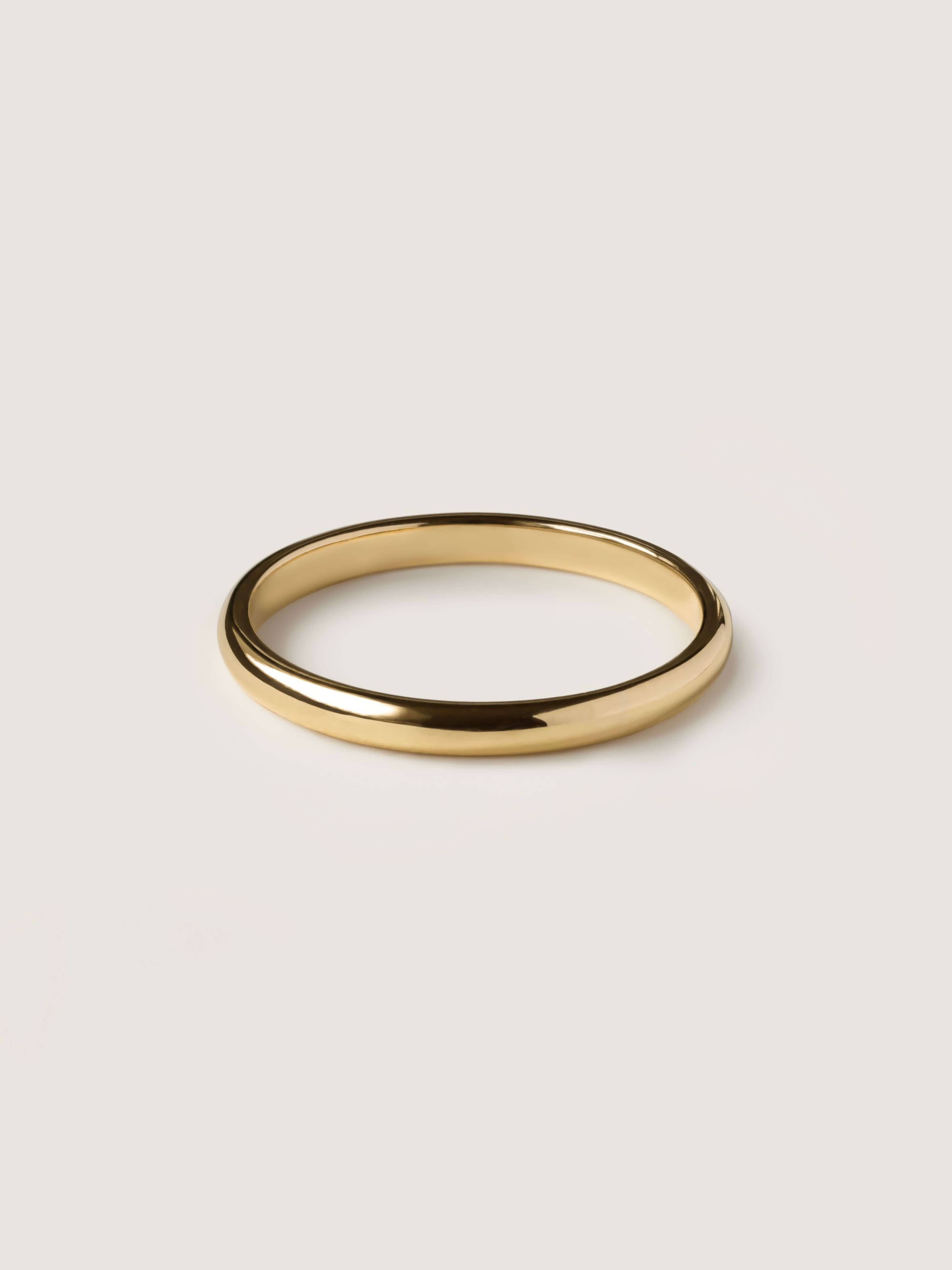 Una alianza de matrimonio que eleva suavemente su perfil hacia el centro, creando una cima sutil que culmina en un punto de luz. En el corazón del aro se encuentra una piedra engastada que actúa como una estrella solitaria, aportando brillo y significado al diseño. La superficie satinada contrasta delicadamente con los bordes pulidos, generando un equilibrio entre suavidad y definición arquitectónica. Esta composición crea una pieza elegante y simbólica donde la cima del anillo se convierte en el lugar donde nace la luz.