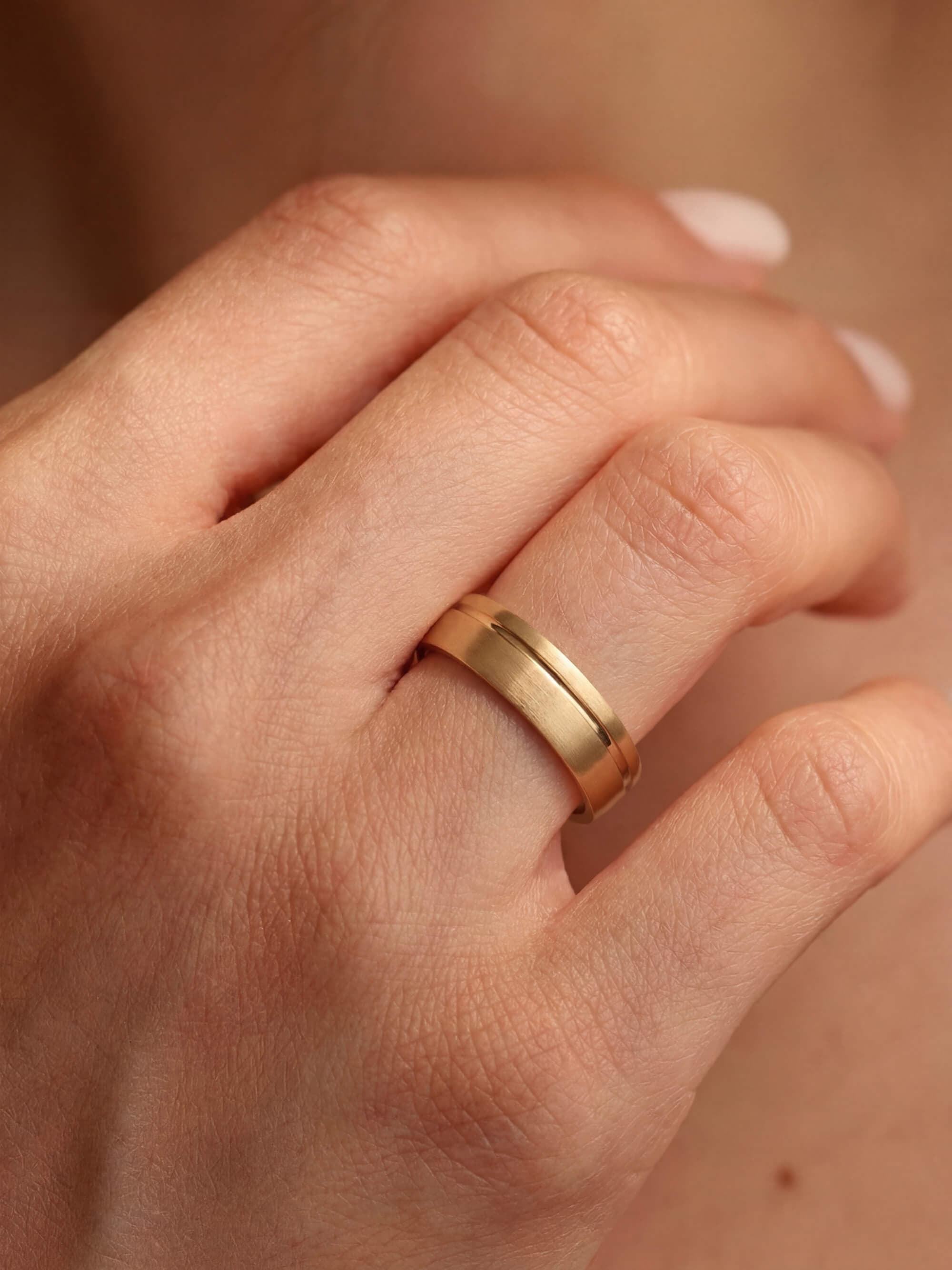 Una alianza de matrimonio donde una franja satinada recorre el centro del aro creando un relieve sutil que contrasta con los bordes pulidos del metal. En el corazón de esta composición aparece una piedra engastada con precisión, generando un único punto de luz que resalta sobre la textura del oro. La arquitectura del diseño mantiene un equilibrio entre superficies suaves y reflejos definidos, permitiendo que el brillo central se convierta en el foco visual de la pieza. El resultado es una alianza elegante y sobria donde el relieve del metal y la luz de la piedra dialogan en perfecta armonía.