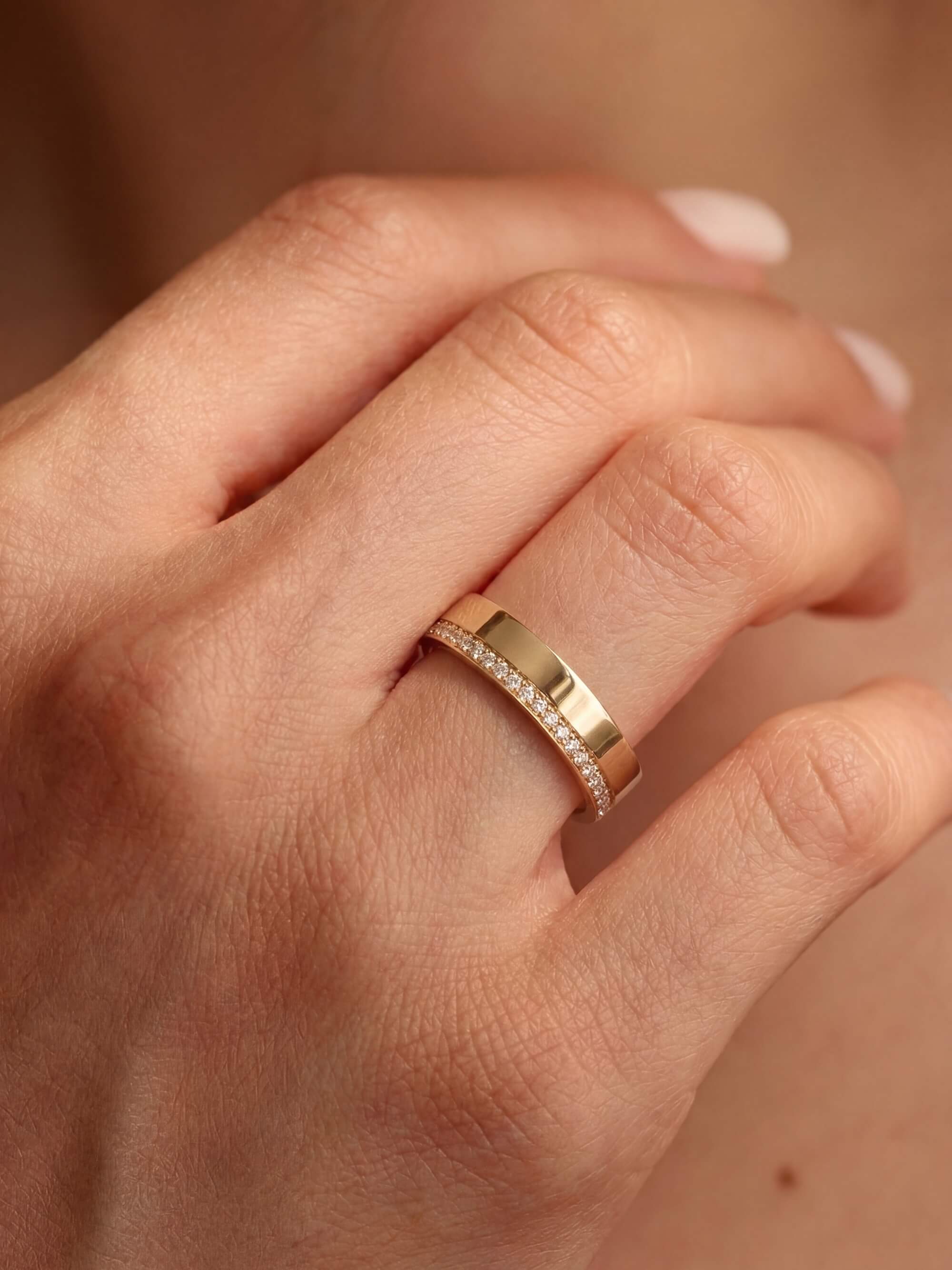Una alianza de matrimonio donde pequeñas estrellas grabadas recorren la superficie del aro creando un ritmo luminoso alrededor del metal. Cada estrella alberga una piedra en su centro, generando puntos de luz que evocan una constelación sobre una banda pulida y continua. La composición equilibra precisión geométrica y delicadeza visual, mientras la superficie refleja la luz de forma suave y constante. El resultado es una pieza que transmite una sensación celestial, donde cada destello recuerda la permanencia y la guía simbólica de las estrellas.