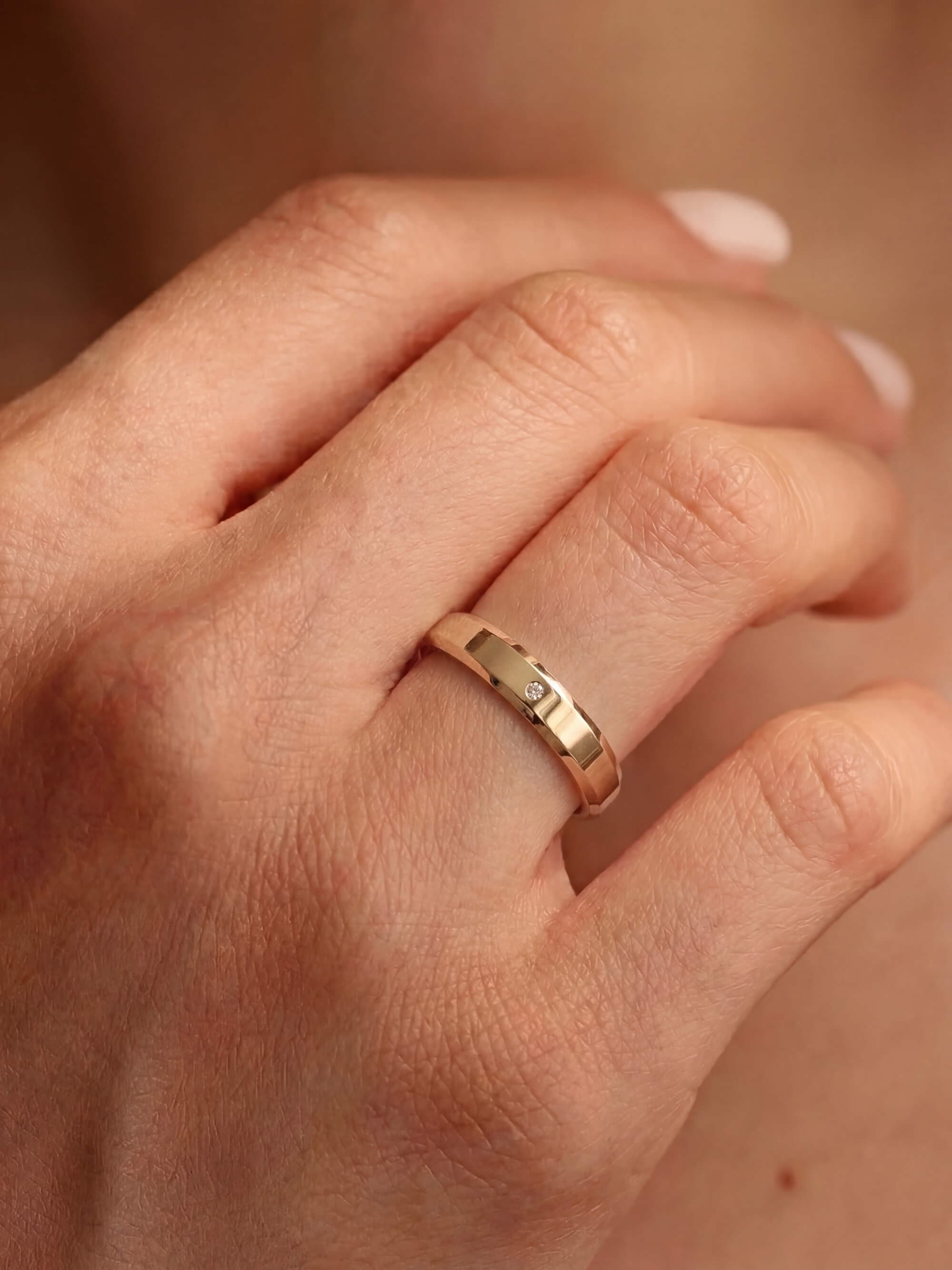 Una alianza de matrimonio definida por una banda delgada que equilibra textura y precisión. La superficie central presenta un acabado granular inspirado en la materialidad natural de la tierra, creando una presencia visual suave pero orgánica. Dos bordes pulidos enmarcan la textura y aportan estructura a la pieza, generando un contraste sutil entre luz y superficie. Su perfil ligero y continuo permite que la alianza mantenga una estética minimalista mientras introduce profundidad a través del acabado texturizado.